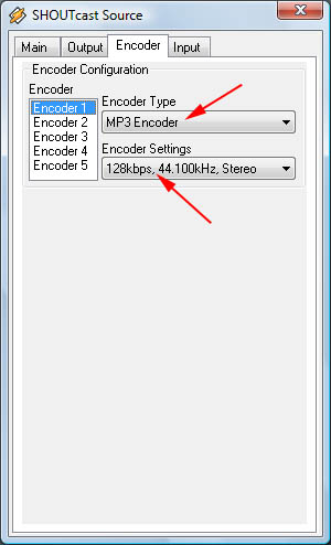 Under fliken "Encoder" ställer du in hur ljudet ska kodas. Välj "Encoder 1", "MP3 Encoder" och "128kbps" enligt nedan: